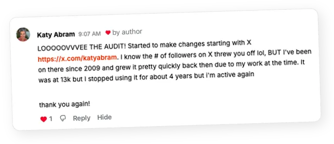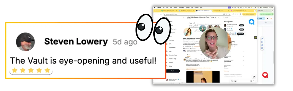 Weekly calls where I review YOUR profile and answer exact questions. A community of creators implementing the same system. Direct access to me when you're stuck Creator collabs happening in real-time Job leads shared before they hit the main feed
